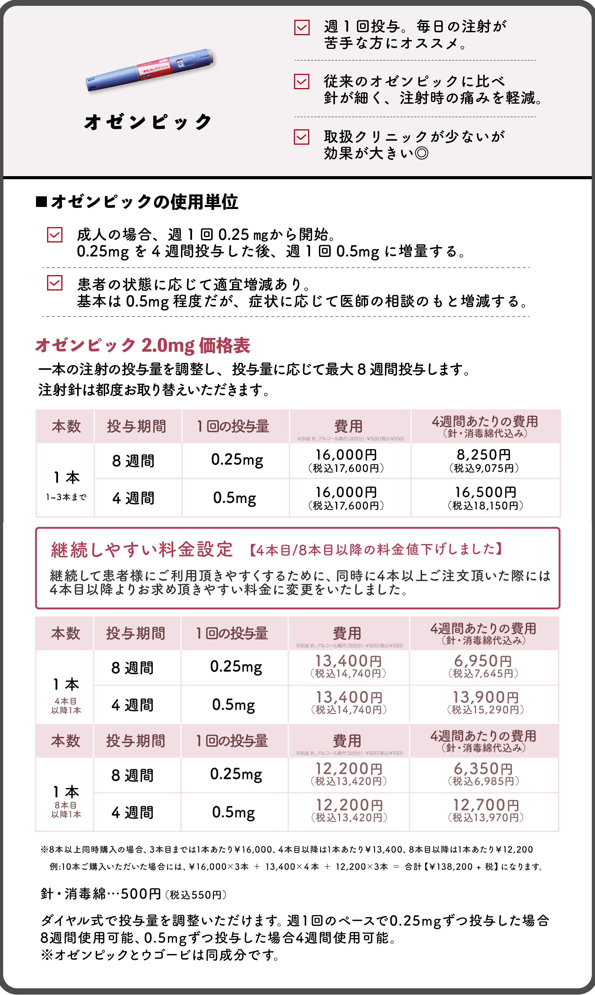 オゼンピックは薬液の注入量が増え痛みが強いといわれております。